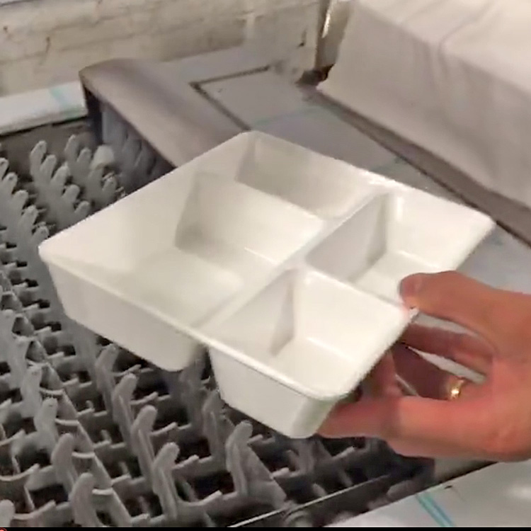 2.擺設(shè)餐具:將餐具碗口朝下放置在傳送帶上,注意不要重疊餐具,擠壓排出物,這樣可避免在機(jī)洗過(guò)程中發(fā)生洗碗不干凈或餐具損壞現(xiàn)象。